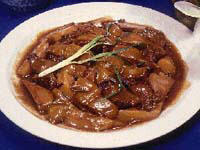 颜色油红光亮,酱香四溢,鲜嫩适口,咸中略甜。