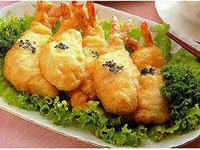 1、将大青虾去壳留尾以精盐、料酒、葱姜汁、花椒精盐稍腌入味后,以牙签每四只串为一排,制成吓排;
