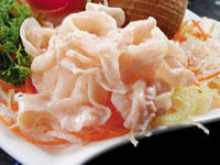 3、另用油锅,加少许猪油烧热后,将螺肉倒下略炒几下,即加黄酒少许 翻炒几下,便离火装盘