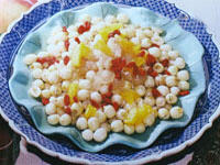 湘白莲200克,冰糖300克,鲜菠萝50克,樱桃25克,青豆25克,桂圆肉25克