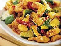 2、锅留底油,放干辣椒爆香,投入鸡丁及调料翻炒,。淋入水淀粉、明油、香油出锅。