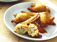 将鸡翅用精盐、料酒、胡椒面码味,鸡蛋、干豆粉调成糊,将鸡翅拌匀。板油去皮切成粒,用热油炒熟; 锅内油烧至六成热,将鸡翅逐条放入炸至呈金黄色捞出;倒去锅中余油,将豆瓣炒出红色,加汤稍煮,捞去豆瓣渣,放入油丁、姜、蒜、葱,加酱油、料酒、白糖,烧透入味,加味