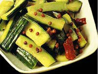 3、炒锅加油置火上,放入花椒,炸出香味后捞出,下干辣椒,炸呈棕红色,将锅离火,再放入黄瓜条,翻炒均匀,加香油,起锅装盘晾凉,浇上调好的味汁即可。