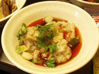 抄手皮20张,肉末50克,料酒、辣椒油、酱油、香油各10克,精盐3克,味精2克,葱20克切末。