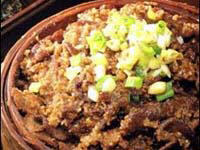 3、用香油,葱花调成葱花油,淋在牛肉上,原笼上桌即成