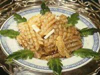 1、鲜鱿鱼撕净套膜,摘下头脑、内脏,治净后去角质内壳,在体内剞花刀后切片,下清汤中汆至入味捞出;