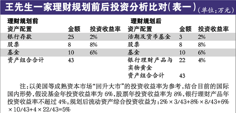 根据目前银行理财产品与实物黄金的收益情况,在未来的3年里每年的综合投资收益率至少可以达到4%,两部分产品作为家庭理财的“稳健”部分。而近三年中,平时的工资积累可以灵活购买各类银行理财产品及基金,若股市走好就可以购买偏股基金,若股市走弱、国债看好则买偏向保守的理财产品。这样一来,家庭流动资产配置在稳健方面与配置在激进方面的比例接近5:4,长远来看趋向3:2。