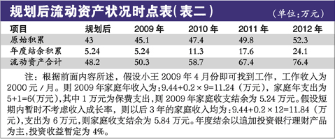 根据表二所示,如果未来经济状况好转,股票、基金投资收益率提高,我们做出以下预测,供王先生家庭参考。根据表二计算,在2012年,家庭可积累76.4万元的流动资产,基本积累够了退休后的养老钱,再考虑买房也不迟。