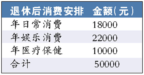 娱乐消费:退休后两口子拥有更多的时间来休闲享受,每月估算约为1000元。王先生可以安排每年1~2次的国内旅游,每两年一次境外旅游或者到美国探亲,平均下来,一年差不多花费10000元。年度娱乐消费额约为:1000×12+10000=22000元。