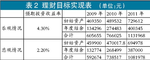 王先生家庭资产大部分集中在存款,理财收益很少,建议对初始资产进行重新组合配置。家庭投资将以追求保值增值,固定稳健为主,投资在股票、基金等风险性资产的比重应降低,债券、银行理财的比重应提高。建议王先生整笔的家庭生息资产,投资于货币基金、基金、银行理财产品、国债的比例分别为:2:2:3:3。投资收益率如表1所示。