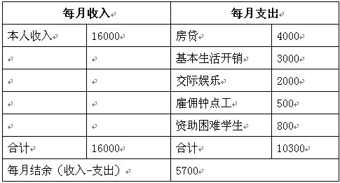 目前,刘先生的月收入为税前2万元左右,扣除“四险一金”后实际到手的约有16000元。而他每月的家庭支出则主要包括:日常生活开销3000元,交际健身等娱乐开销2000元,聘请钟点工人打扫卫生费用500元,资助困难学生上学800元。而作为副总经理,公司无偿提供了一部汽车给其使用,所以刘先生并不需要负担任何的养车费用。