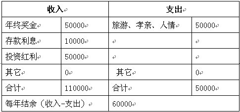 在年度收支方面,刘先生介绍,其年度收入主要有几个方面,一是公司的年终奖金,5万元左右;二是存款利息,将近1万元;另外,刘先生早年参股了老家一位朋友的工厂,现在每年还能分到3万~5万元不等的红利。而在支出方面,则有那么几大项:外出旅游、给父母的孝敬费用、逢年过节给老家亲戚的一些红包,总共有5万元。