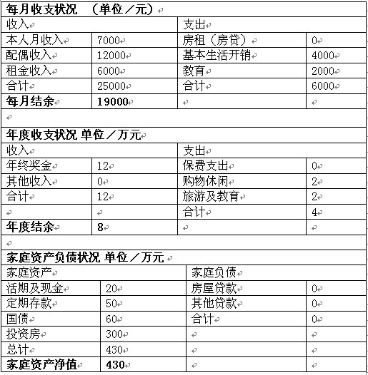 张女士和先生目前有着不错的收入水平,同时由于开支有限,有着丰富的结余。每月收入25000元中,结余19000元,而年度收入12万元中,也能有8万元的结余。一年全部的结余金额可达30万元,结余比例高达73%。