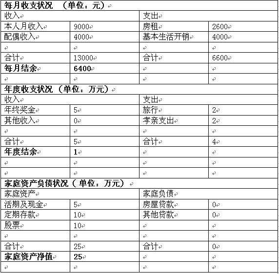 因为平时也没有什么特别的规划,小韩的结余主要是一部分存在银行,一部分放在股市。家庭的现金和活存5万元,定期存款10万元,再加上股市里的10万元,家庭资产满打满算也就25万元左右。