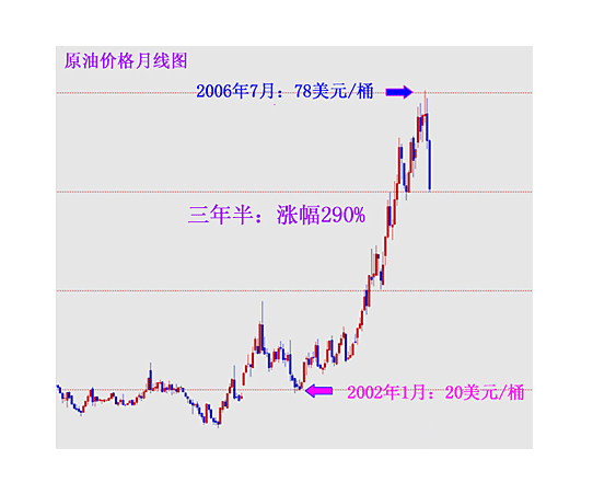 原油价格自2002年1月约20美元/桶,最高涨至2006年7月78美元左右。促使油价飑升的原因之一是世界经济连续平稳快速增长,不论是美国还是以中国为的新兴市场国家,经济表现都非常良好,使得对原油的需求大增。而供给方面的因素则是世界原油产业脆弱的供需平衡,由于剩余产能有限,再加上地缘局势动荡,市场对原油供给可能中断的担忧一直未去,从而推升了油价至二十多年来高点。