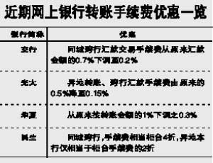 近日,交通银行宣布,从6月1日起,下调个人网银同城跨行汇款交易手续费:即从原来按汇款金额的0.7%下调到0.2%,将原来的最高收费50元下调到20元。光大银行则宣布,对个人网银转账汇款功能中的“本行转账”项、“跨行汇款”项手续费打3折,打折后本行异地转账、跨行汇款手续费由原来的0.5%降至0.15%,手续费上限也相应调低。与此同时,华夏银行和民生银行也纷纷抛出优惠政策,华夏表示,对于此前“按转账金额的1%收取手续费,最低1元,最高50元”的措施实施3折优惠,最低每笔1元。而民生提出,个人普通卡客户通过网银进行同城跨行汇款,手续费不及柜台手续费的4折,异地同行通过网银渠道汇款仅相当于柜台手续费的2折。