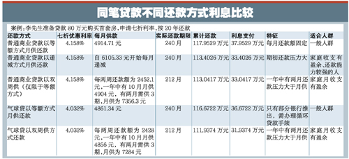 解决方案:由于李先生贷的是普通商业贷款,没有公积金贷款的限制,几乎所有的商业银行都可以成为李先生的贷款对象。目前,在月供还款方式之外,一些银行推出了双周供、气球贷等创新型还款方式。如果李先生的还款能力稍强,合理选择和搭配这些还款方式,利息最多可以节省6.0155万元。