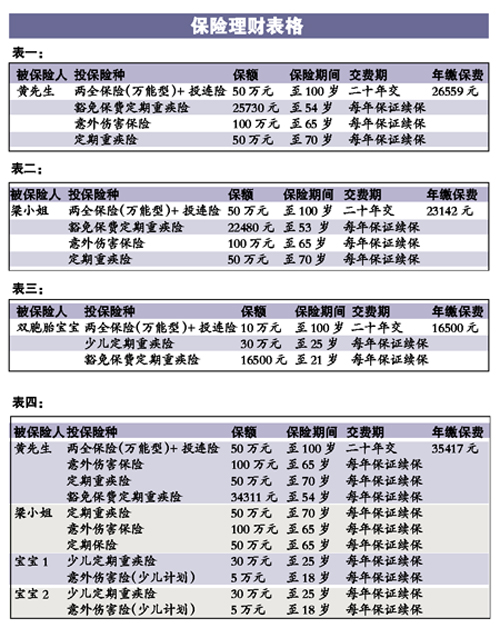 以黄先生夫妇为例,黄先生今年34岁,太太梁小姐今年33岁,二人有一对1岁的双胞胎宝宝,在保障内容基本相同的情况下,每人购买一份保险和全家人一起购买一份保险会有哪些不同呢?通过右边四个表格可以看到,如果黄先生想达到上述保障额度,家庭每人购买一份保险每年所需总保费是82701元;而如果合成一张保单,则每年所需的总保费为35417元,保费总支出减少47284元。