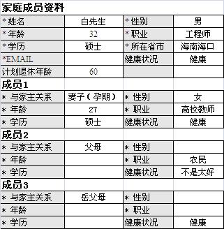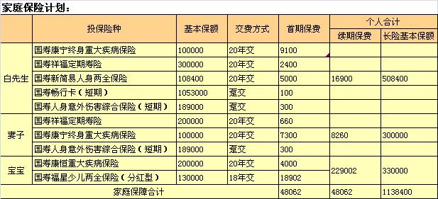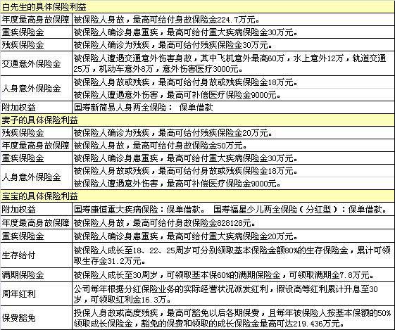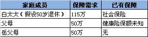 2、白太太和父母们的保障也很薄弱,还需要逐步进行配置。白太太职业高尚、收入稳定,是家庭的核心人物之一,建议根据实际情况适当购买重疾保险和意外伤害保险。双方父母年龄已经较大,投保商业保险费用较高,而白先生父母身体欠佳,可能为非标准体而不能参加商业保险,因此应积极参加农村合作医疗和城镇居民合作医疗保险,着重建立老人医疗紧急备用金,以防不测发生。