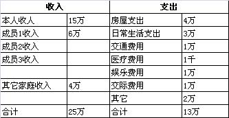 2)家庭的工作收入和其他理财收入分别约占收入的84%和16%。夫妇二人工资收入(主动性收入)占绝大部分,其他理财收入(被动性收入)只占总收入的16%。被动性收入占总支出的30.7%,不足以支付一年的开销,未来将要赡养4位老人和一个孩子,面临较大压力。