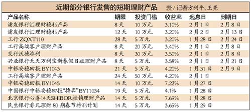 例如工行专门针对高端客户推出的24天期理财产品,投资门槛50万元,收益率高达4.2%,已经高于目前市场上常见的一年期理财产品的收益率,而交行针对沃德客户推出的8天期理财产品,收益率高达3.5%,兴业银行天天万利宝新春假日版理财产品,期限8天,年化收益率高达3.58%。