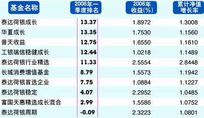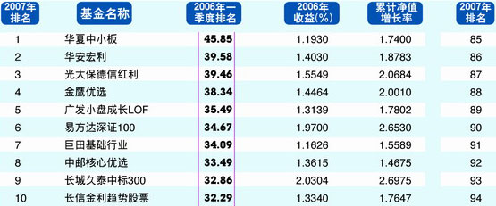 截止4月中旬,今年以来表现最靓丽的是华夏基金出品的大盘精选和中小板ETF,这两只基金分别以79.74%和69.24%位列榜首,而最次的回报来自泰达荷银周期,这只成立于2003年的老牌基金仅仅帮投资者赚到了14.21%。相比于2006年的基金普涨,2007年的基金选择变得更加艰难,稍有不慎,投资者获得的回报可能会相差6倍。