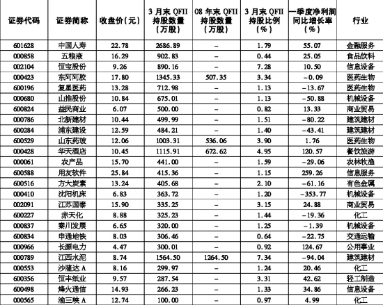 此外,QFII增持的股票多数为中小盘股,只有中国人寿(601628)和五粮液(000858)两只股票属于中证100成分股。在这些股票中,26只股票2009年一季度净利润实现同比增长,占股票总数的一半。显然,在2009年上市公司经营面临困境的环境下,选择成长性较好的中小盘股成为了QFII规避风险的途径之一。