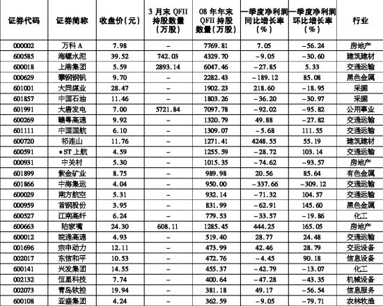 通过已披露的一季报十大流通股股东名单统计,QFII持有其中96只股票的股份,持股数量合计12.08亿股。而2008年年末,在这些可比公司中,QFII持有98只股票的股份,持股数量合计14.58亿股。虽然QFII持有股票只数相差不大,不过持股数量环比却出现了大幅减少,下降幅度达到了17.15%。