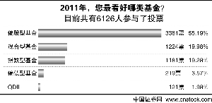 上周,中国证券网进行了“2011年您最看好哪类基金”的网络互动调查,结果显示,有3381名网友投票选择了“偏股型基金”,占所有参与投票总人数的55.23%;此外,有1224名网友投票选择了“混合型基金”,占所有参与投票总人数的19.93%;有1181名网友投票选择了“指数型基金”,占所有参与投票总人数的19.28%;有219名网友投票选择了“偏债型基金”,占所有参与投票总人数的3.59%;另外还有121名网友投票选择了“QDII基金”,占所有参与投票总人数的1.96%。