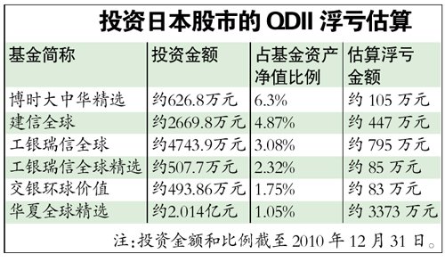 日经指数暴跌,让投资于日本股市的QDII基金深陷其中。据统计,目前已经成立的QDII基金共有33只,其中投资于日本股市的QDII较少,共有6只,占比不到两成。据基金2010年四季报,截至去年12月31日,上述6只QDII基金投资于日本股市总额约2.9亿元。据估算,上述基金两日浮亏共计约4888万元。