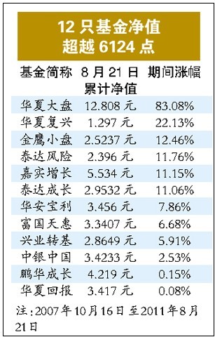 据统计,截至8月21日,12只开放式偏股基金的累计净值已超越2007年10月16日的累计净值,包括2只股票型基金,10只混合型基金。其中,华夏大盘12.808元的累计单位净值,早已超越2007年10月16日7.19元的累计净值,涨幅高达83.08%。此外还有11只偏股基金也实现了超越,华夏复兴、金鹰中小盘、泰达宏利风险预算的累计净值较6124点当日的累计净值涨幅也均超过10%。