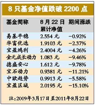 截至本周一,上证指数在2500点附近,但有8只开放式偏股基金的净值还跌破2200点,包括宝石动力、宝盈区域、中欧趋势等。
