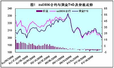 图1反映了自2008年1月9日上海期货交易所上市黄金期货交易以来,黄金现货Au(T+D)交易价格和黄金期货au0806合约价格走势及两者期现价差情况。