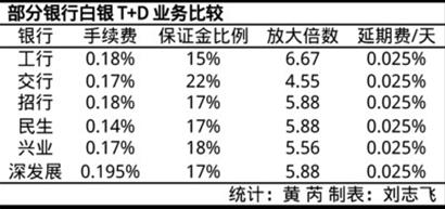 白银T+D业务最主要的特点是采用保证金杠杆交易,日前,上海金交所为了防范风险,统一将白银T+D的保证金起点比例提高到12%,各银行白银T+D的杠杆比例在此基础上相应上调,各自的杠杆比例也不尽相同。尽管杠杆比例普遍上调,降低了一定的风险,但是若按15%的杠杆比例,则意味着投资者的资金可以被放大6.67倍,也就是收益和风险同时放大6.67倍。目前白银T+D的交易单位为1手,即1000克,按昨天现货白银6.3元/克计算,价值为6300元,按照15%的保证金比例,仅需要945元的保证金。