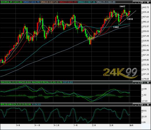现货黄金周四(3月31日)收出带上下影线的大阳线,上方最高升至1439.30,下方最低位于1420.20。