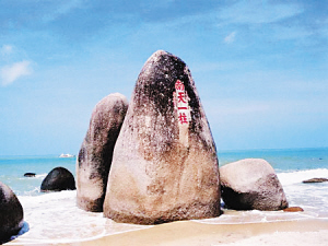 钱币上的图案做了艺术处理——让巨石屹立在大浪之中,显得雄浑壮观,实际上这块石头的位置是在沙滩上。科学家说近年气候变暖海面上升,也许有一天2元人民币上的图案会变成现实。“南天一柱”据说是清代宣统年间崖州知州范云梯所书。