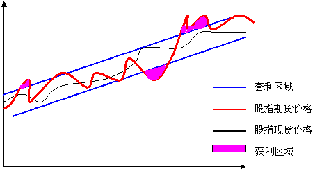 从国外股指期货市场的实践来看,实际股指期货价格往往会偏离理论价格。当实际股指期货价格大于理论股指期货价格时,投资者可以通过买进股指所涉及的股票,并卖空股指期货而牟利;反之,投资者可以通过上述操作的反向操作而牟利。这种交易策略称作指数套利(IndexArbitrage)。然而,在成离市场中,实际股指期货价格和理论期货价格的偏离,总处于一定的幅度内。例如,美国S&P500指数期货的价格,通常位于其理论值的上下0.5%幅度内,这就可以在一定程度上避免风险套利的情况。